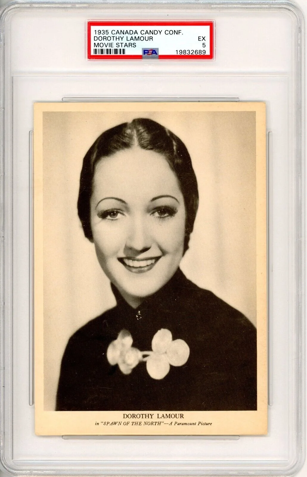 Shop › 1935 Canada Candy Confectionary Movie Stars PSA 6 Highest Grade Dorthy Lamour Image 1 of 1 1935 Canada Candy Confectionary Movie Stars PSA 6 Highest Grade Dorthy Lamour $178.00 Kriskepplersportscards Add To Cart Added! Kriskepplersportscards