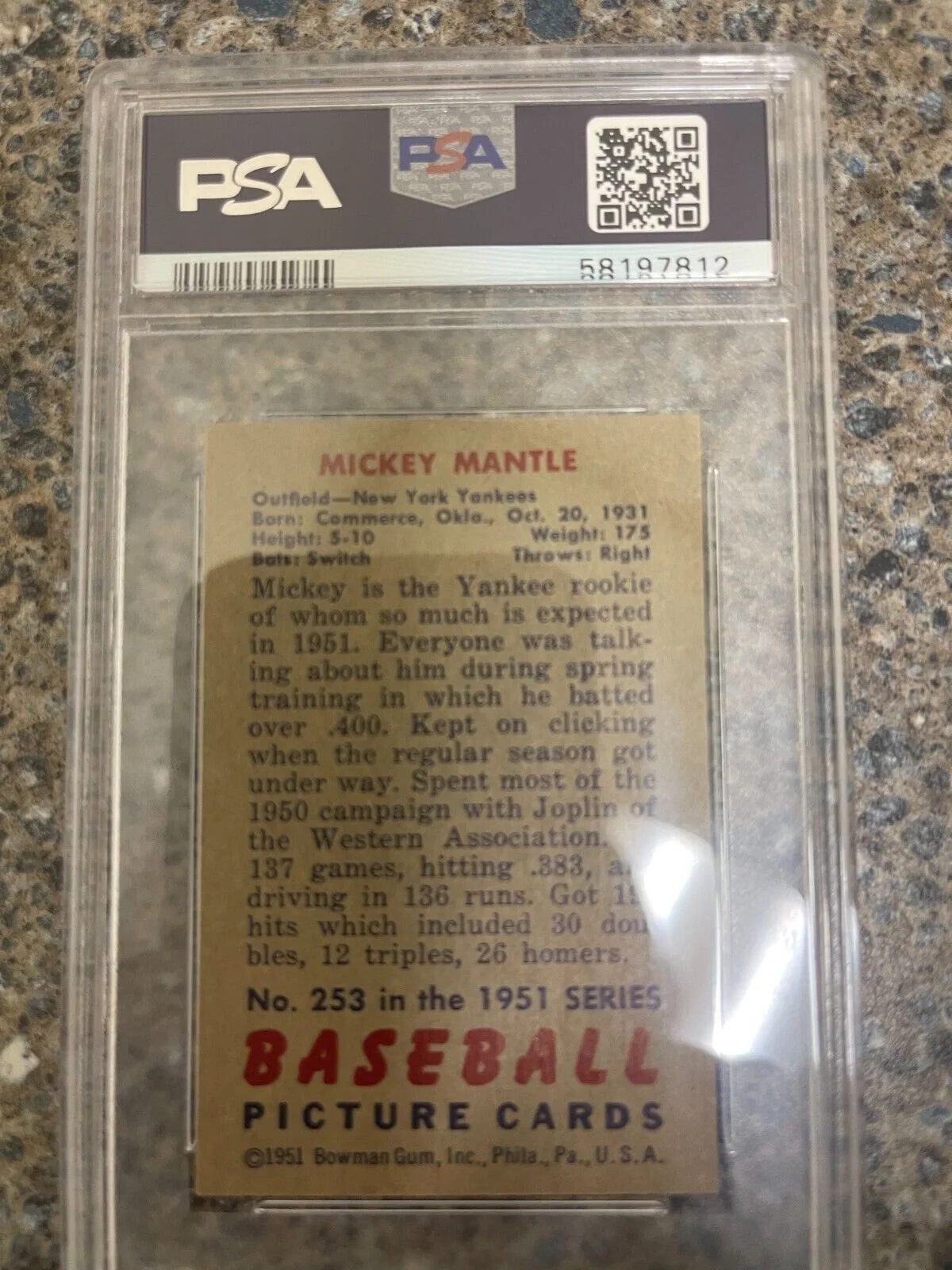 Shop › 1951 Bowman Mickey Mantle #253 PSA 7 Yankees Image 1 of 2 Image 2 of 2 1951 Bowman Mickey Mantle #253 PSA 7 Yankees $157,007.00 Thousands of high grade PSA cards available New cards added weekly Always check KRISKEPPLERSPORTSCARDS Add To Cart Added! Thousands of high grade PSA cards available New cards added weekly Always check KRISKEPPLERSPORTSCARDS