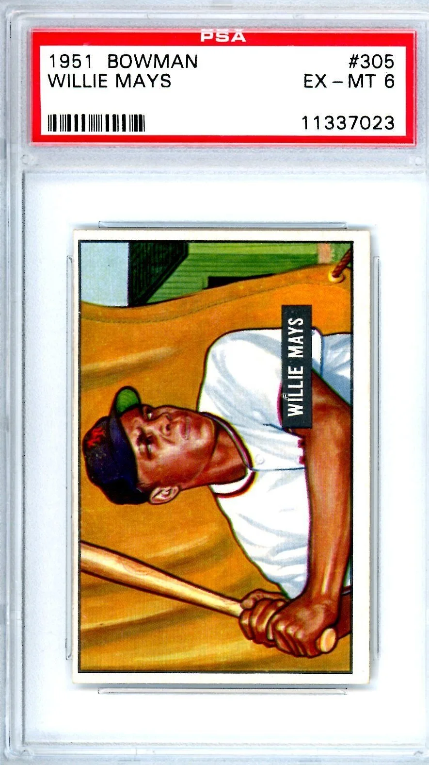 Shop › 1951 Bowman Willie Mays Giants #305 PSA 6 10500 Image 1 of 1 1951 Bowman Willie Mays Giants #305 PSA 6 10500 $46,934.00 Thousands of high grade PSA cards available New cards added weekly Always check KRISKEPPLERSPORTSCARDS Add To Cart Added! Thousands of high grade PSA cards available New cards added weekly Always check KRISKEPPLERSPORTSCARDS