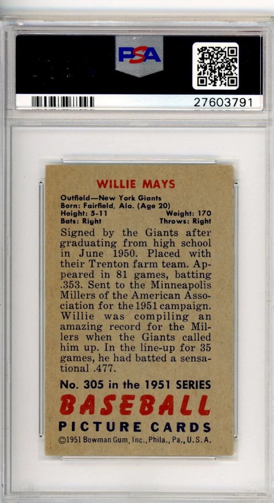 Shop › 1951 Bowman Willie Mays 305 PSA 4.5 Giants 15080 Image 1 of 2 Image 2 of 2 1951 Bowman Willie Mays 305 PSA 4.5 Giants 15080 $18,489.00 Thousands of high grade PSA cards available New cards added weekly Always check KRISKEPPLERSPORTSCARDS Add To Cart Added! Thousands of high grade PSA cards available New cards added weekly Always check KRISKEPPLERSPORTSCARDS