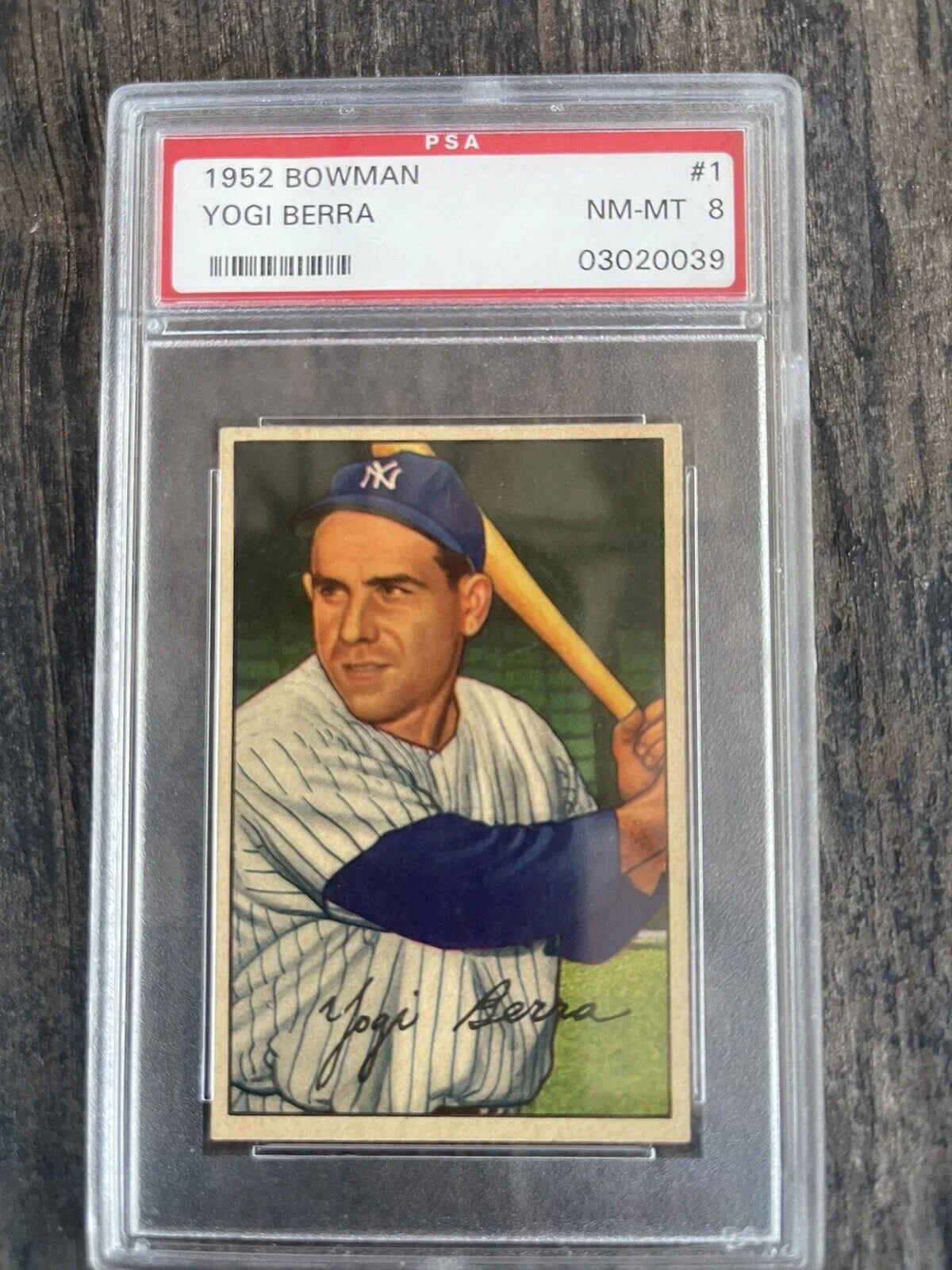Shop › 1952 Bowman Yogi Berra PSA 8 NM-MT SHARP! (Card #1) Yankees Image 1 of 1 1952 Bowman Yogi Berra PSA 8 NM-MT SHARP! (Card #1) Yankees $7,900.00 1952 Bowman Yogi Berra PSA 8 NM-MT SHARP! (Card #1) Yankees. Condition is Graded. Shipped with USPS Ground Advantage. Add To Cart Added! 1952 Bowman Yogi Berra PSA 8 NM-MT SHARP! (Card #1) Yankees. Condition is Graded. Shipped with USPS Ground Advantage.