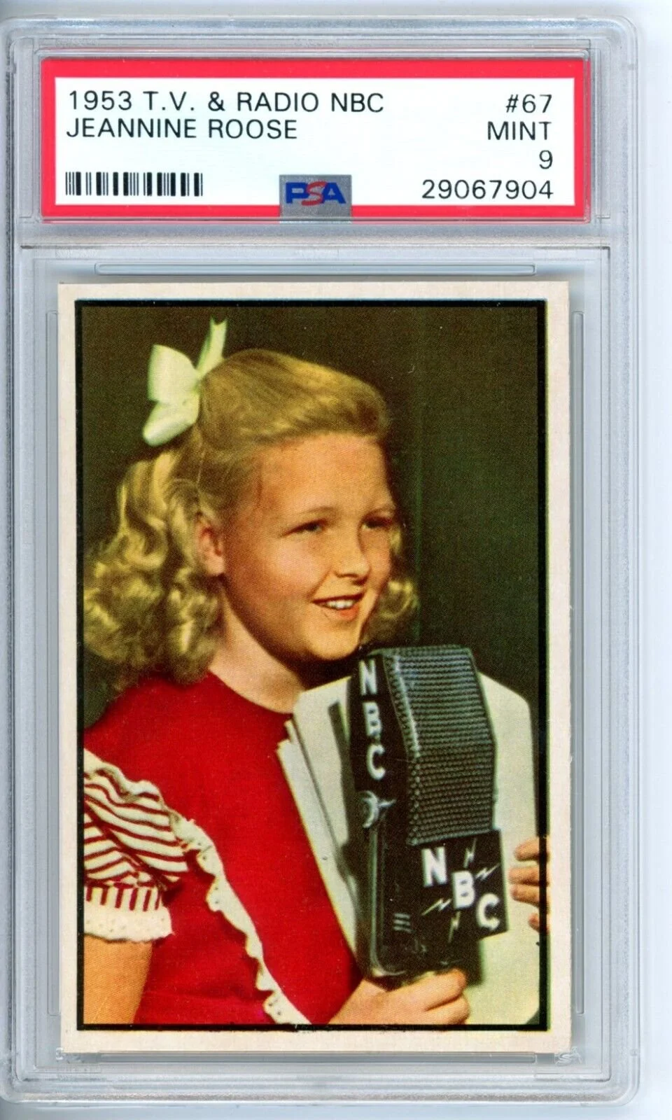 Shop › 1953 Bowman TV & Radio NBC Jeannine Roose 67 PSA 9 12998 Image 1 of 1 1953 Bowman TV & Radio NBC Jeannine Roose 67 PSA 9 12998 $497.00 sold out Thousands of high grade PSA cards available New cards added weekly Always check KRISKEPPLERSPORTSCARDS Sold Out Added! Thousands of high grade PSA cards available New cards added weekly Always check KRISKEPPLERSPORTSCARDS