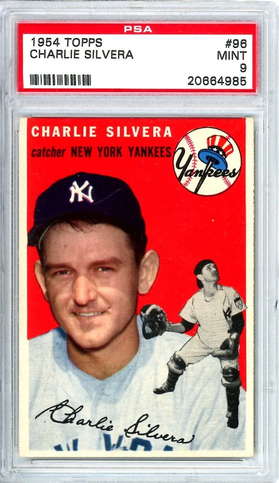 Shop › 1954 Topps Charlie Silvera #96 PSA 9 Yankees 11519 Image 1 of 1 1954 Topps Charlie Silvera #96 PSA 9 Yankees 11519 $1,553.00 Thousands of high grade PSA cards available New cards added weekly Always check KRISKEPPLERSPORTSCARDS Add To Cart Added! Thousands of high grade PSA cards available New cards added weekly Always check KRISKEPPLERSPORTSCARDS