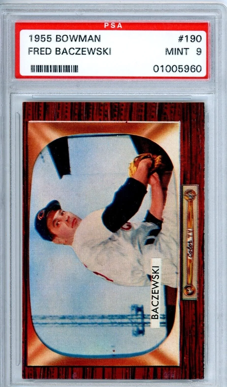 Shop › 1955 Bowman Fred Baczewski 190 PSA 9 Reds Image 1 of 1 1955 Bowman Fred Baczewski 190 PSA 9 Reds $1,485.00 Thousands of high grade PSA cards available New cards added weekly Always check KRISKEPPLERSPORTSCARDS Add To Cart Added! Thousands of high grade PSA cards available New cards added weekly Always check KRISKEPPLERSPORTSCARDS