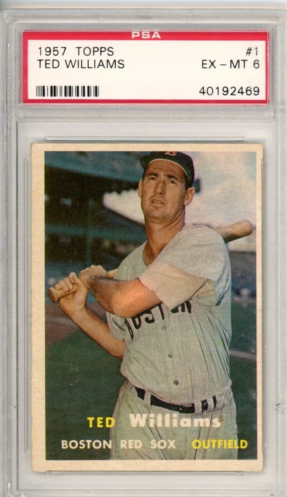 Shop › 1957 Topps Ted Williams #1 PSA 6 Red Sox Image 1 of 1 1957 Topps Ted Williams #1 PSA 6 Red Sox $1,200.00 Thousands of high grade PSA cards available New cards added weekly Always check KRISKEPPLERSPORTSCARDS Add To Cart Added! Thousands of high grade PSA cards available New cards added weekly Always check KRISKEPPLERSPORTSCARDS