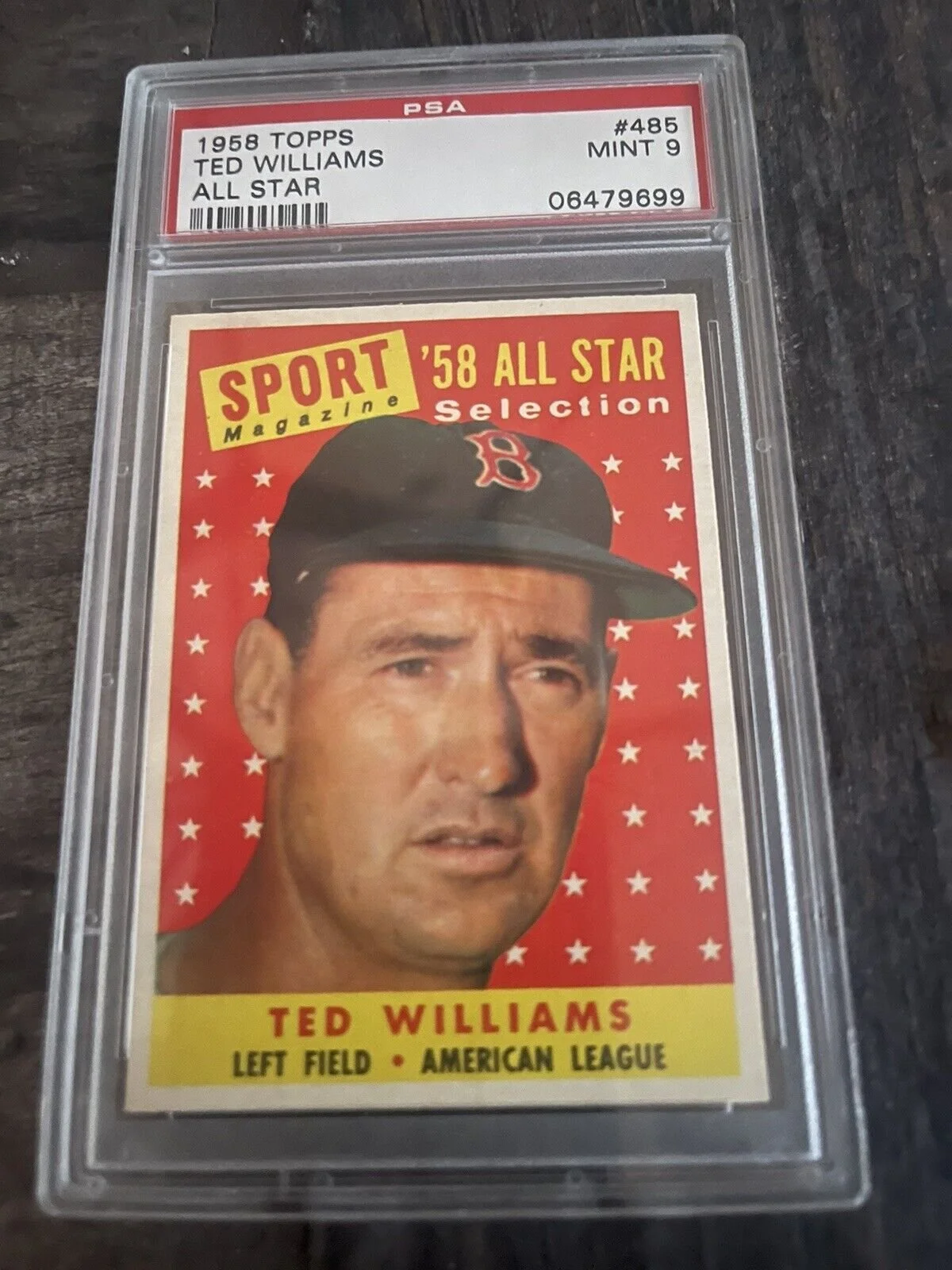 Shop › 1958 Topps Ted Williams All-star 485 PSA 9 Red Sox 170 Image 1 of 1 1958 Topps Ted Williams All-star 485 PSA 9 Red Sox 170 $7,985.00 1958 Topps Ted Williams All-star 485 PSA 9 Red Sox 170. Condition is Graded. Shipped with USPS Ground Advantage. Add To Cart Added! 1958 Topps Ted Williams All-star 485 PSA 9 Red Sox 170. Condition is Graded. Shipped with USPS Ground Advantage.