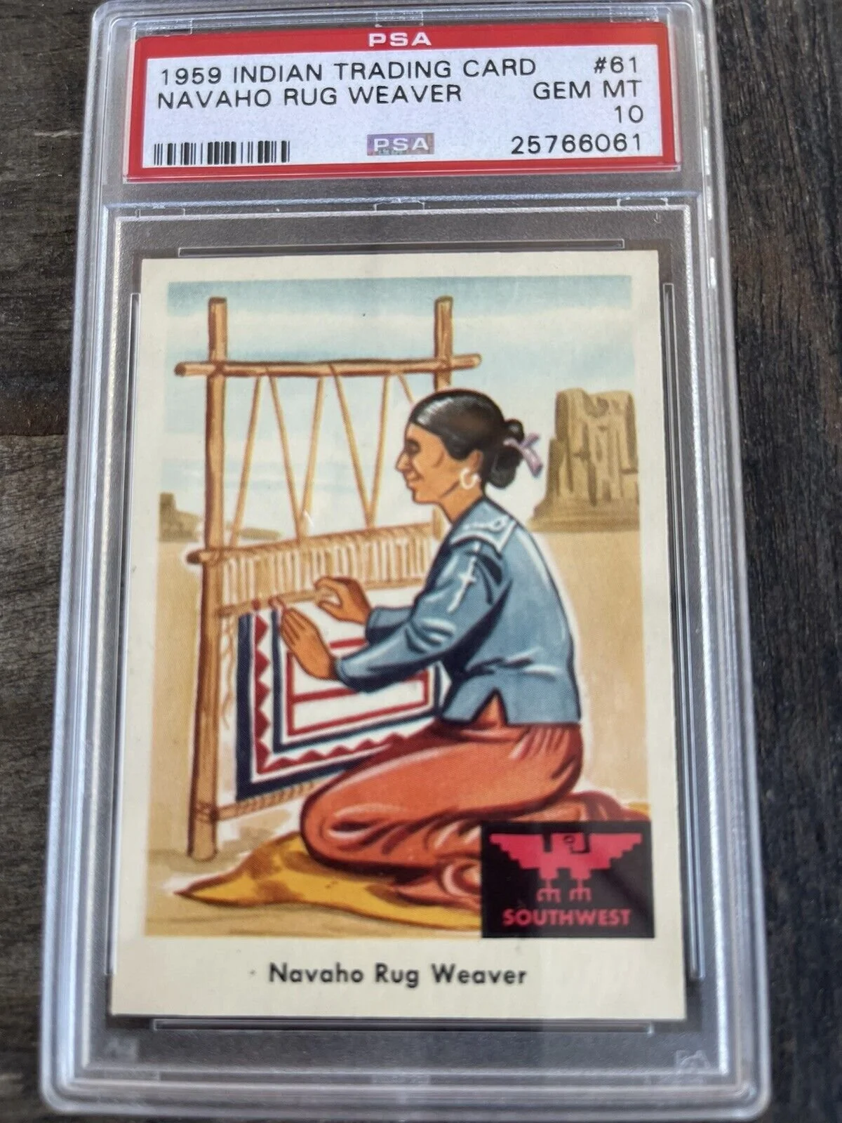 Shop › 1959 Indian Trading Navaho Rug Weaver #61 PSA 10 Image 1 of 1 1959 Indian Trading Navaho Rug Weaver #61 PSA 10 $89.00 1959 Indian Trading Navaho Rug Weaver #61 PSA 10. Condition is Graded. Shipped with USPS Ground Advantage. Add To Cart Added! 1959 Indian Trading Navaho Rug Weaver #61 PSA 10. Condition is Graded. Shipped with USPS Ground Advantage.