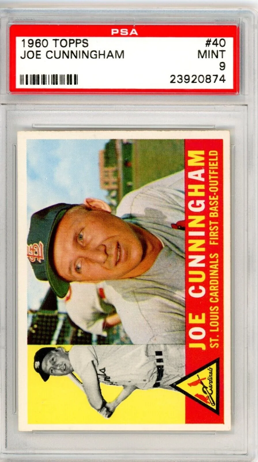 Shop › 1960 Topps Joe Cunningham 40 PSA 9 Cardinals Image 1 of 1 1960 Topps Joe Cunningham 40 PSA 9 Cardinals $598.00 Thousands of high grade PSA cards available New cards added weekly Always check KRISKEPPLERSPORTSCARDS Add To Cart Added! Thousands of high grade PSA cards available New cards added weekly Always check KRISKEPPLERSPORTSCARDS