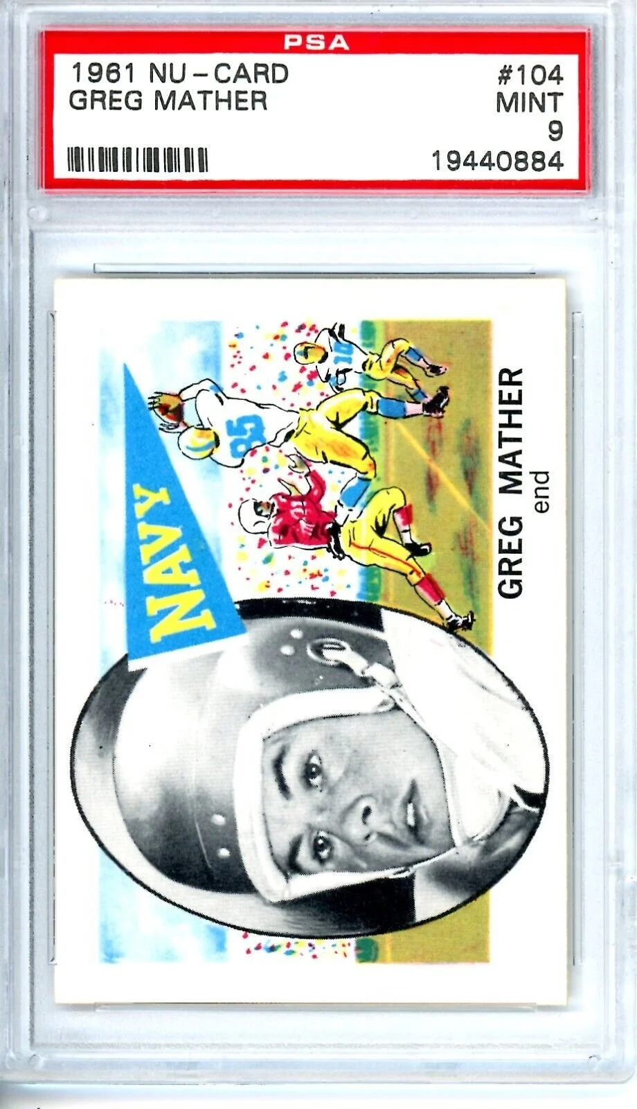 Shop › 1961 Nu-cards Greg Mather #104 PSA 9 Navy 11051 Image 1 of 1 1961 Nu-cards Greg Mather #104 PSA 9 Navy 11051 $18.00 Thousands of high grade PSA cards available New cards added weekly Always check KRISKEPPLERSPORTSCARDS Add To Cart Added! Thousands of high grade PSA cards available New cards added weekly Always check KRISKEPPLERSPORTSCARDS