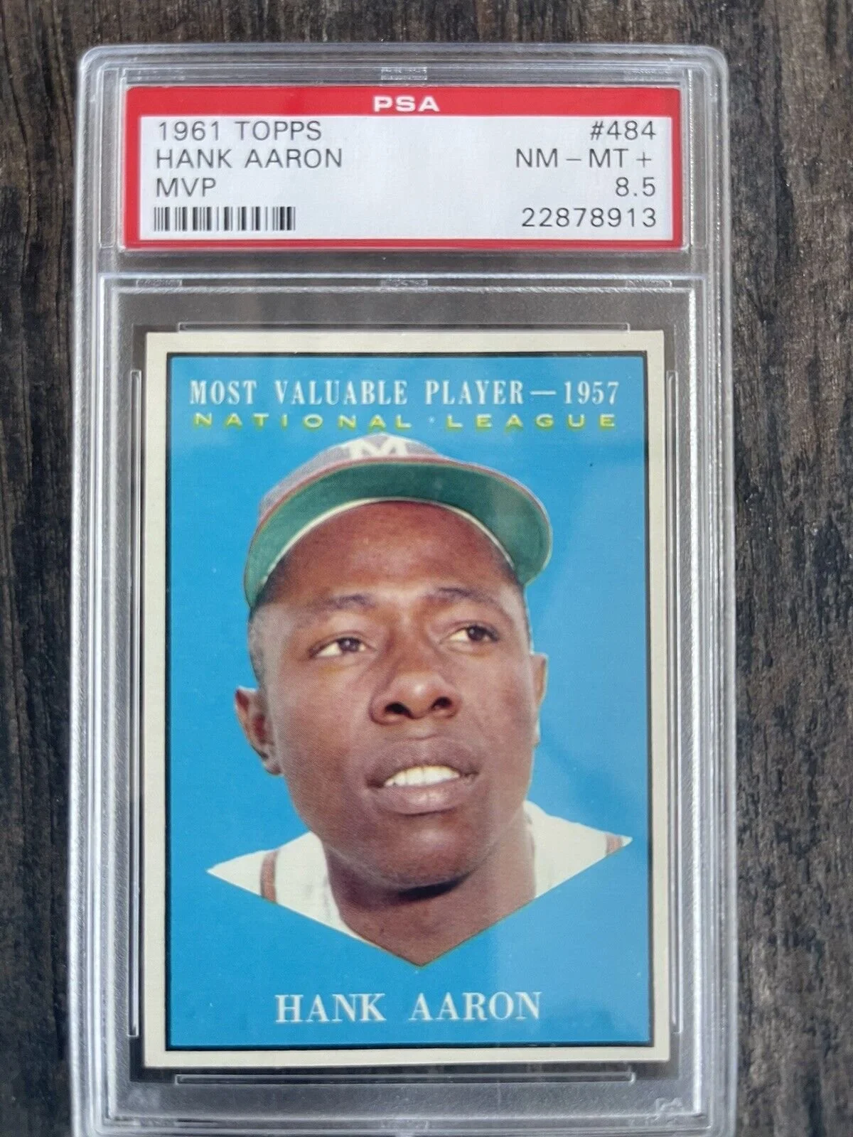 Shop › 1961 Topps Hank Aaron MVP Braves HOF #484 PSA 8.5 Image 1 of 1 1961 Topps Hank Aaron MVP Braves HOF #484 PSA 8.5 $975.00 1961 Topps Hank Aaron MVP Braves HOF #484 PSA 8.5. Condition is Graded. Shipped with USPS Ground Advantage. Add To Cart Added! 1961 Topps Hank Aaron MVP Braves HOF #484 PSA 8.5. Condition is Graded. Shipped with USPS Ground Advantage.