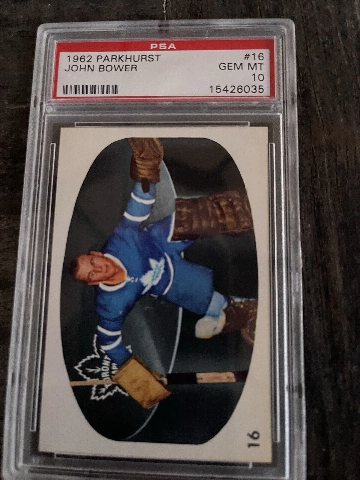 Shop › 1962 Parkhurst John Bower #16 PSA 10 Maple Leafs Image 1 of 1 1962 Parkhurst John Bower #16 PSA 10 Maple Leafs $746.00 1962 Parkhurst John Bower #16 PSA 10 Maple Leafs. Condition is Graded. Shipped with USPS Ground Advantage. Add To Cart Added! 1962 Parkhurst John Bower #16 PSA 10 Maple Leafs. Condition is Graded. Shipped with USPS Ground Advantage.