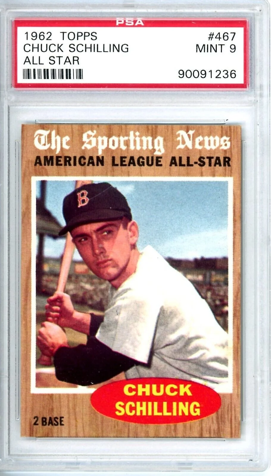 Shop › 1962 Topps Chuck Schilling #467 PSA 9 Red Sox 10738 Image 1 of 1 1962 Topps Chuck Schilling #467 PSA 9 Red Sox 10738 $589.00 Thousands of high grade PSA cards available New cards added weekly Always check KRISKEPPLERSPORTSCARDS Add To Cart Added! Thousands of high grade PSA cards available New cards added weekly Always check KRISKEPPLERSPORTSCARDS