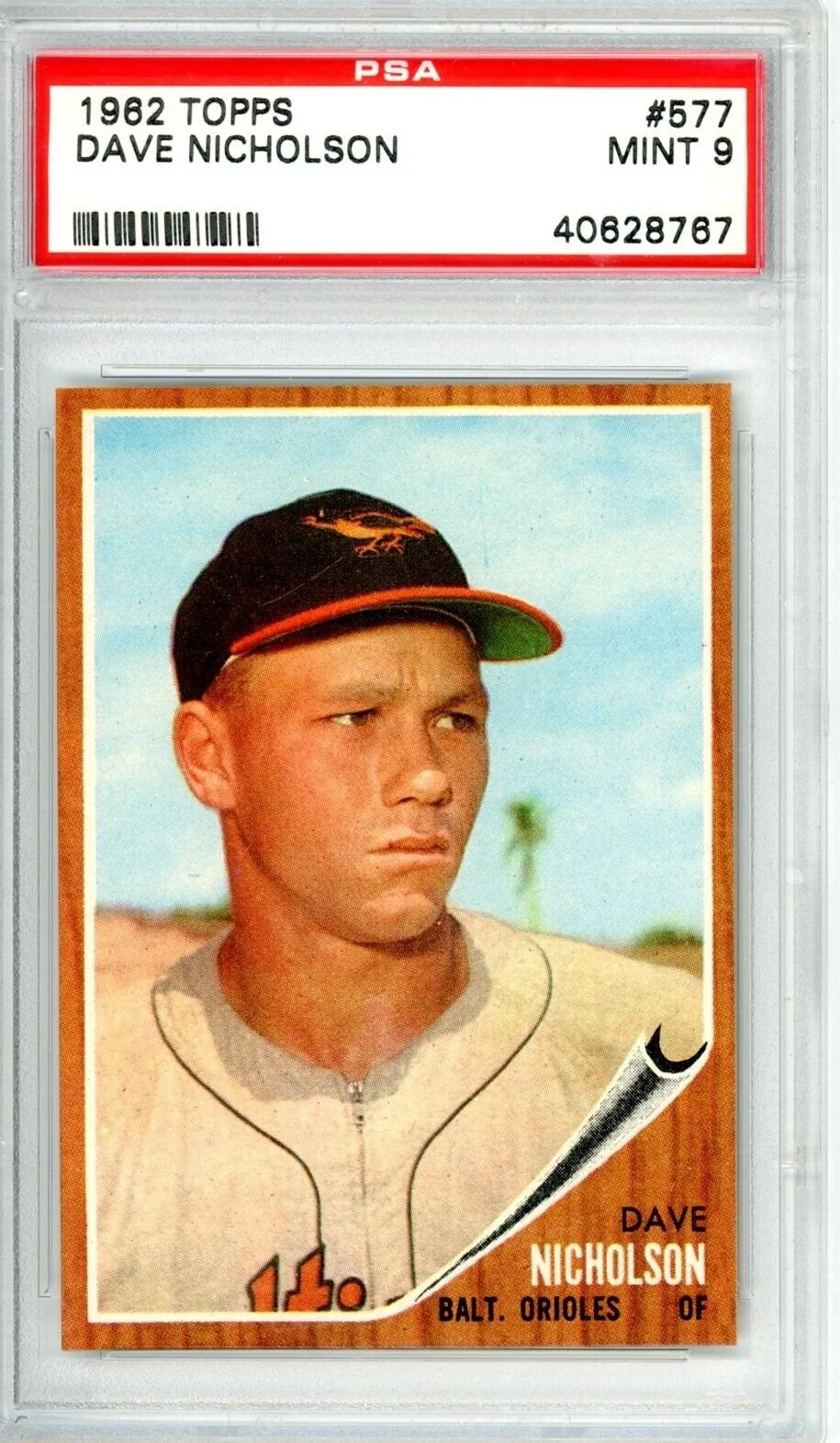 Shop › 1962 Topps Dave Nicholson 577 PSA 9 Orioles 11761 Image 1 of 1 1962 Topps Dave Nicholson 577 PSA 9 Orioles 11761 $231.00 Thousands of high grade PSA cards available New cards added weekly Always check KRISKEPPLERSPORTSCARDS Add To Cart Added! Thousands of high grade PSA cards available New cards added weekly Always check KRISKEPPLERSPORTSCARDS