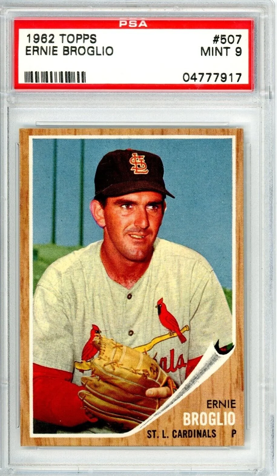 Shop › 1962 Topps Ernie Broglio 507 PSA 9 Cardinals 11759 Image 1 of 1 1962 Topps Ernie Broglio 507 PSA 9 Cardinals 11759 $643.00 Thousands of high grade PSA cards available New cards added weekly Always check KRISKEPPLERSPORTSCARDS Add To Cart Added! Thousands of high grade PSA cards available New cards added weekly Always check KRISKEPPLERSPORTSCARDS