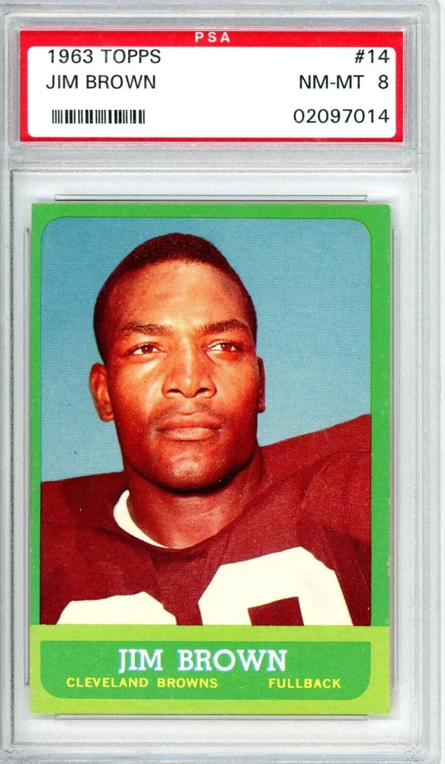 Shop › 1963 Topps Jim Brown #14 PSA 8 Browns Image 1 of 1 1963 Topps Jim Brown #14 PSA 8 Browns $5,091.00 Thousands of high grade PSA cards available New cards added weekly Always check KRISKEPPLERSPORTSCARDS Add To Cart Added! Thousands of high grade PSA cards available New cards added weekly Always check KRISKEPPLERSPORTSCARDS