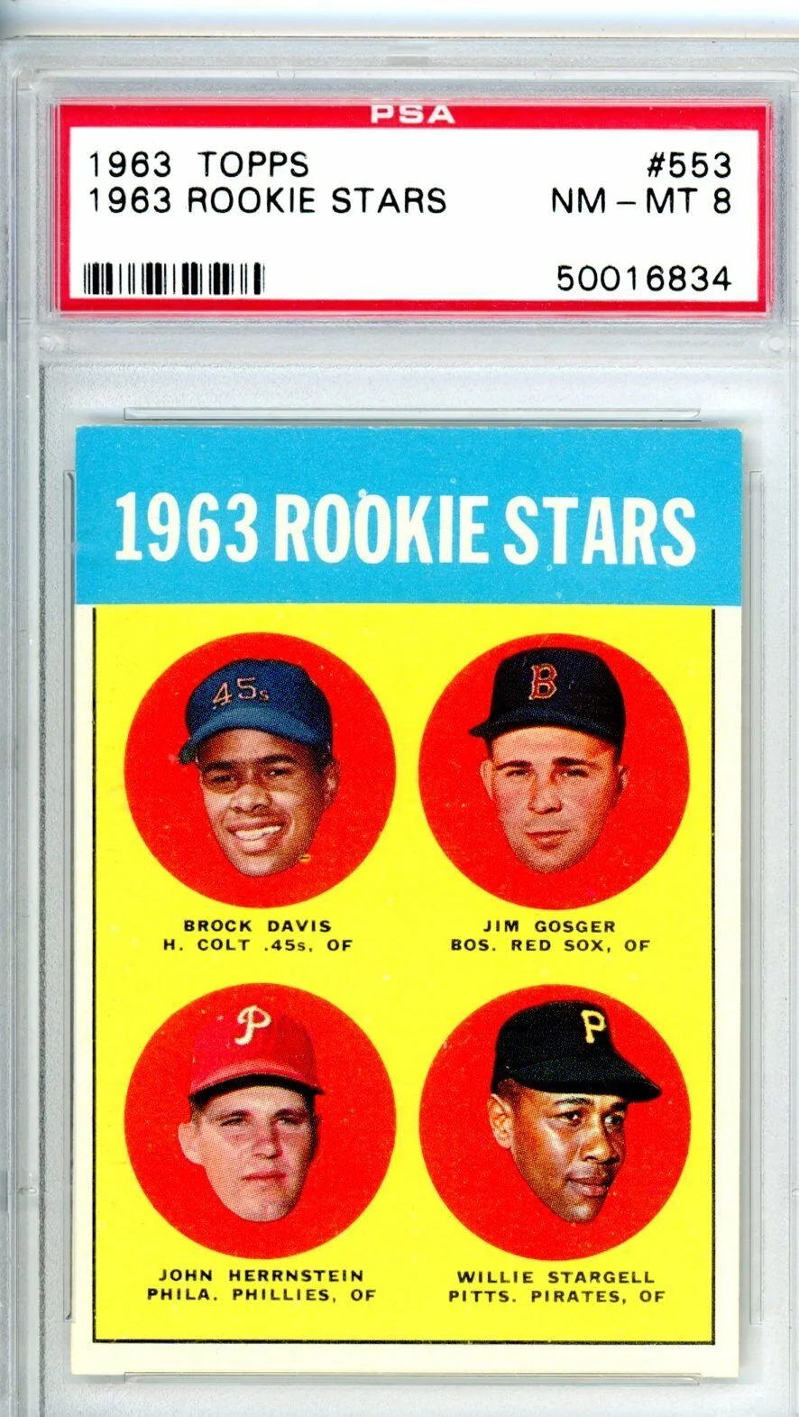 Shop › 1963 Topps Rookie Stars Willie Stargell 553 PSA 8 Pirates 11296 Image 1 of 1 1963 Topps Rookie Stars Willie Stargell 553 PSA 8 Pirates 11296 $2,008.00 Kriskepplersportscards Add To Cart Added! Kriskepplersportscards
