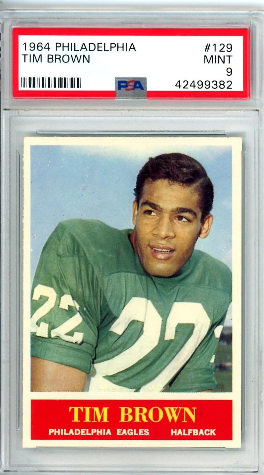 Shop › 1964 Philadelphia Tim Brown #129 Eagles PSA 9 12401 Image 1 of 1 1964 Philadelphia Tim Brown #129 Eagles PSA 9 12401 $72.00 Thousands of high grade PSA cards available New cards added weekly Always check KRISKEPPLERSPORTSCARDS Add To Cart Added! Thousands of high grade PSA cards available New cards added weekly Always check KRISKEPPLERSPORTSCARDS