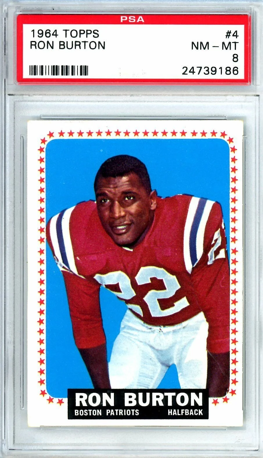 Shop › 1964 Topps Ron Burton #4 PSA 8 Patriots 11188 Image 1 of 1 1964 Topps Ron Burton #4 PSA 8 Patriots 11188 $86.00 Thousands of high grade PSA cards available New cards added weekly Always check KRISKEPPLERSPORTSCARDS Add To Cart Added! Thousands of high grade PSA cards available New cards added weekly Always check KRISKEPPLERSPORTSCARDS