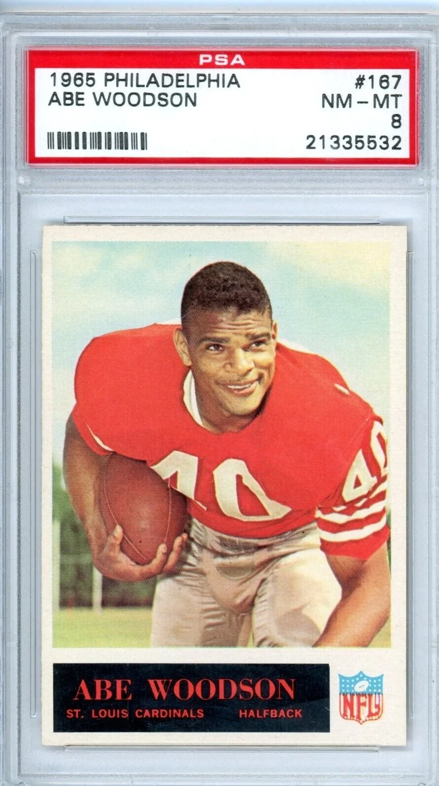 Shop › 1965 Philadephia Abe Woodson 167 PSA 8 Cardinals Image 1 of 1 1965 Philadephia Abe Woodson 167 PSA 8 Cardinals $19.00 Thousands of high grade PSA cards available New cards added weekly Always check KRISKEPPLERSPORTSCARDS Add To Cart Added! Thousands of high grade PSA cards available New cards added weekly Always check KRISKEPPLERSPORTSCARDS