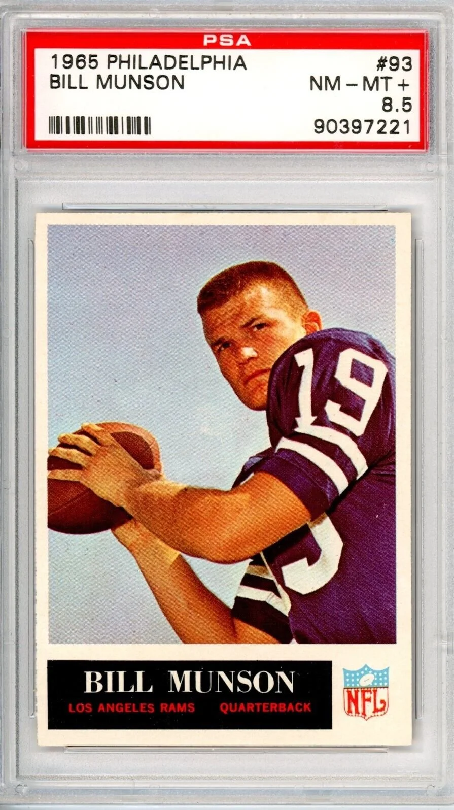 Shop › 1965 Philadephia Bill Munson 93 PSA 8.5 14165 Rams Image 1 of 1 1965 Philadephia Bill Munson 93 PSA 8.5 14165 Rams $30.00 Thousands of high grade PSA cards available New cards added weekly Always check KRISKEPPLERSPORTSCARDS Add To Cart Added! Thousands of high grade PSA cards available New cards added weekly Always check KRISKEPPLERSPORTSCARDS