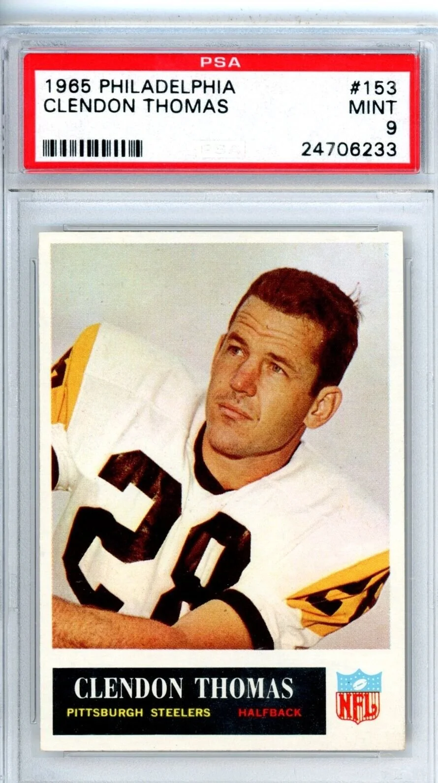 Shop › 1965 Philadephia Clendon Thomas 153 PSA 9 Steelers Image 1 of 1 1965 Philadephia Clendon Thomas 153 PSA 9 Steelers $199.00 Thousands of high grade PSA cards available New cards added weekly Always check KRISKEPPLERSPORTSCARDS Add To Cart Added! Thousands of high grade PSA cards available New cards added weekly Always check KRISKEPPLERSPORTSCARDS