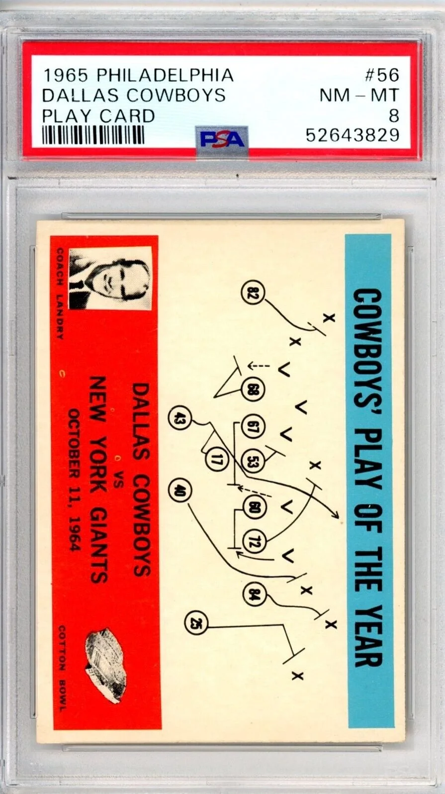 Shop › 1965 Philadephia Dallas Cowboys Play 56 PSA 8 14157 Cowboys Image 1 of 1 1965 Philadephia Dallas Cowboys Play 56 PSA 8 14157 Cowboys $49.00 Thousands of high grade PSA cards available New cards added weekly Always check KRISKEPPLERSPORTSCARDS Add To Cart Added! Thousands of high grade PSA cards available New cards added weekly Always check KRISKEPPLERSPORTSCARDS