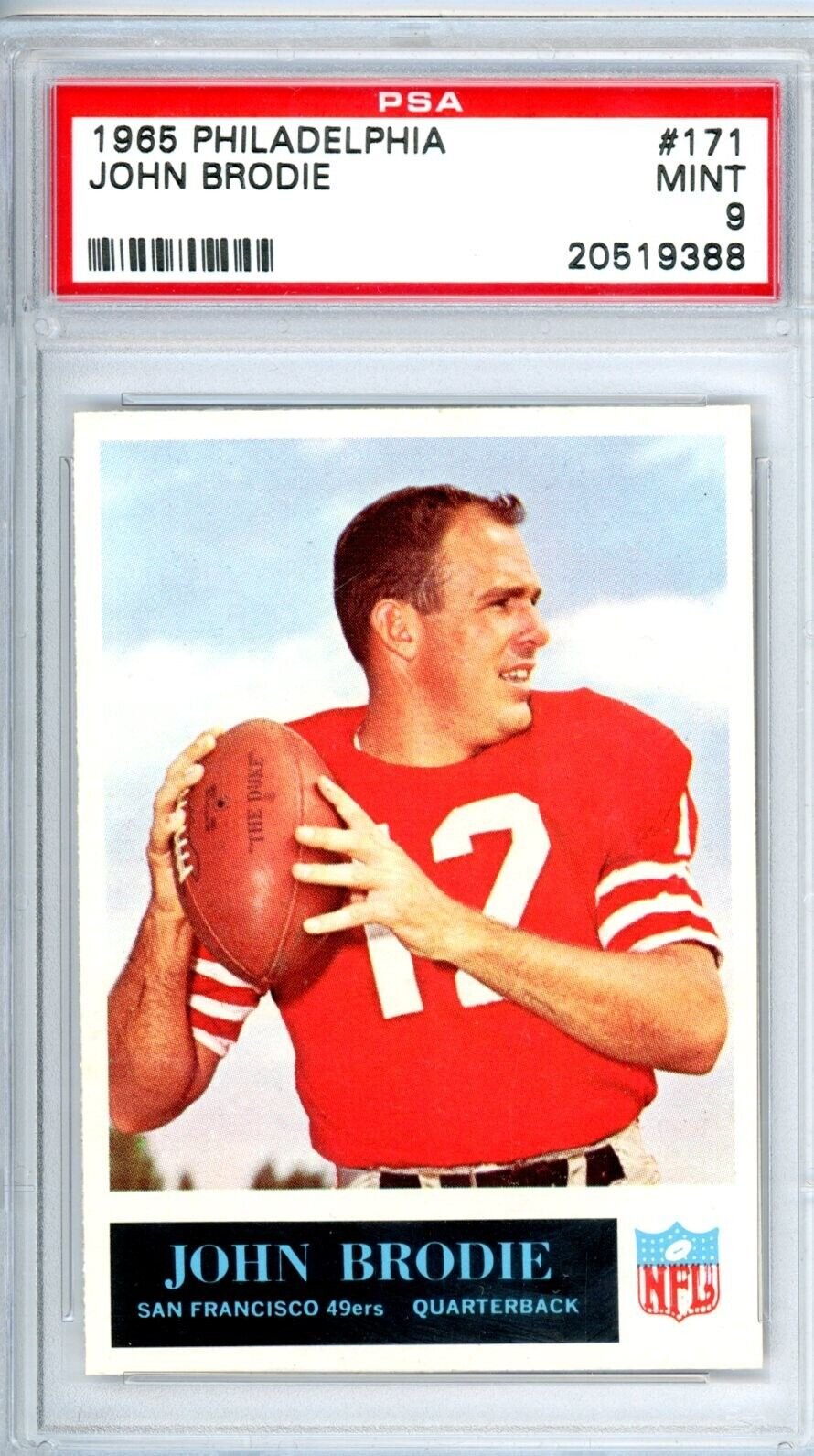 Shop › 1965 Philadephia John Brodie 171 PSA 9 49'ers Image 1 of 1 1965 Philadephia John Brodie 171 PSA 9 49'ers $749.00 Thousands of high grade PSA cards available New cards added weekly Always check KRISKEPPLERSPORTSCARDS Add To Cart Added! Thousands of high grade PSA cards available New cards added weekly Always check KRISKEPPLERSPORTSCARDS