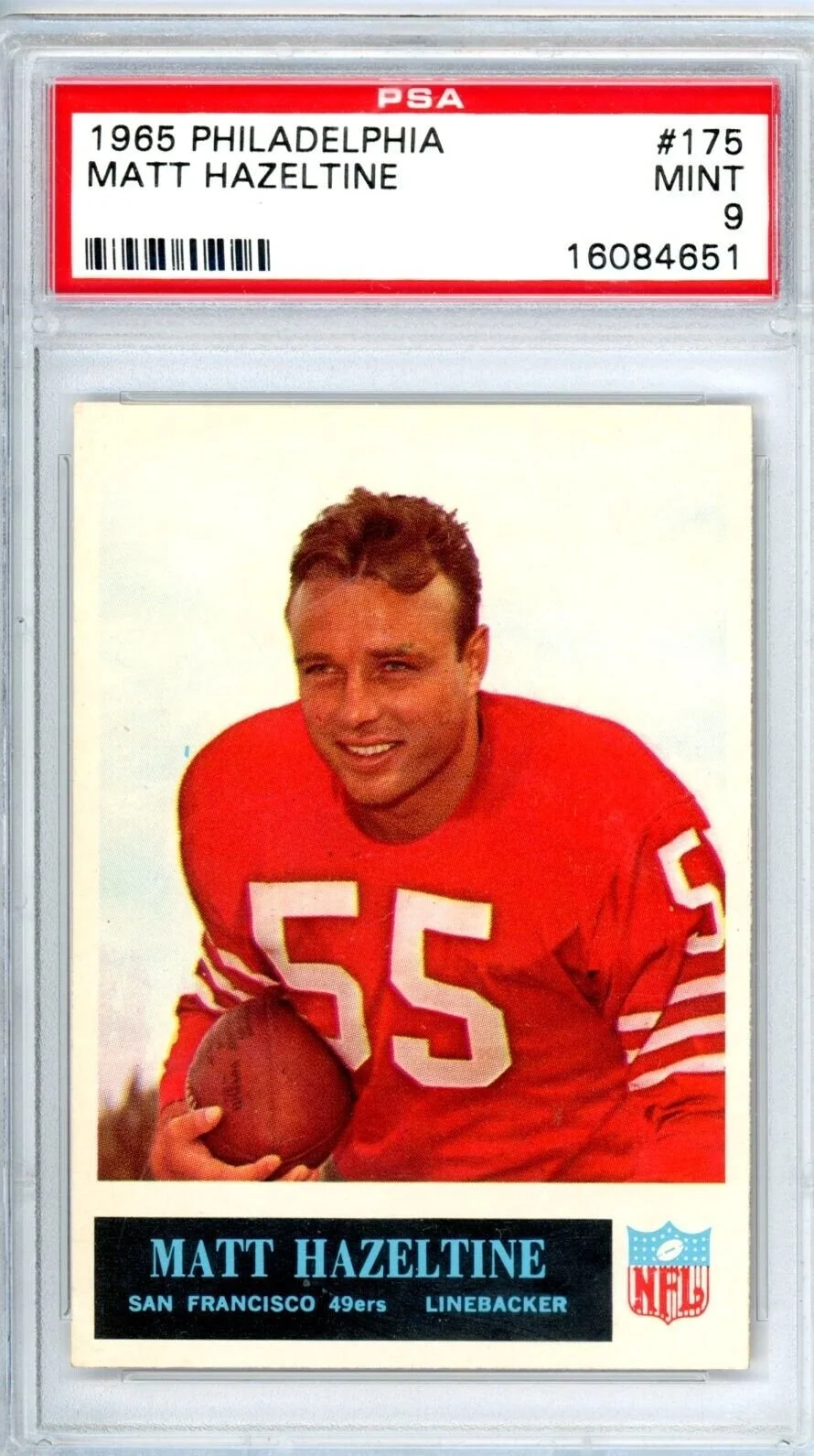 Shop › 1965 Philadephia Matt Hazeltine 175 PSA 9 49'ers Image 1 of 1 1965 Philadephia Matt Hazeltine 175 PSA 9 49'ers $249.00 Thousands of high grade PSA cards available New cards added weekly Always check KRISKEPPLERSPORTSCARDS Add To Cart Added! Thousands of high grade PSA cards available New cards added weekly Always check KRISKEPPLERSPORTSCARDS