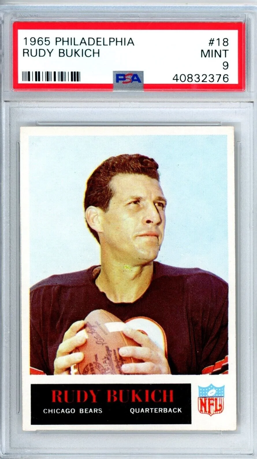 Shop › 1965 Philadephia Rudy Bukich 18 PSA 9 Bears Image 1 of 1 1965 Philadephia Rudy Bukich 18 PSA 9 Bears $99.00 Thousands of high grade PSA cards available New cards added weekly Always check KRISKEPPLERSPORTSCARDS Add To Cart Added! Thousands of high grade PSA cards available New cards added weekly Always check KRISKEPPLERSPORTSCARDS