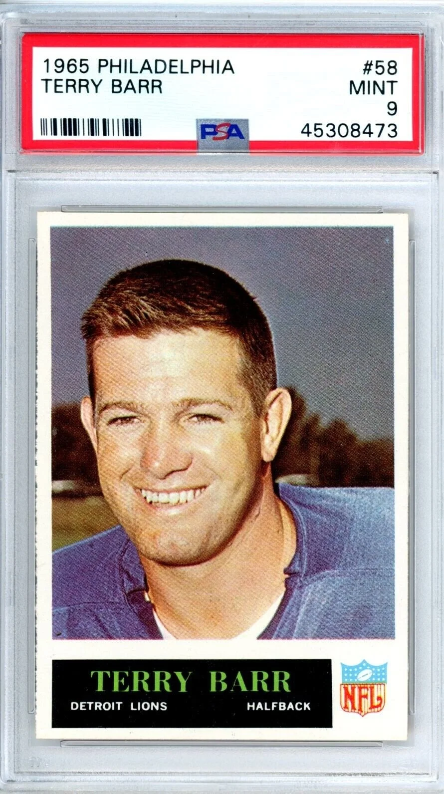 Shop › 1965 Philadephia Terry Barr 58 PSA 9 Lions Image 1 of 1 1965 Philadephia Terry Barr 58 PSA 9 Lions $750.00 Thousands of high grade PSA cards available New cards added weekly Always check KRISKEPPLERSPORTSCARDS Add To Cart Added! Thousands of high grade PSA cards available New cards added weekly Always check KRISKEPPLERSPORTSCARDS