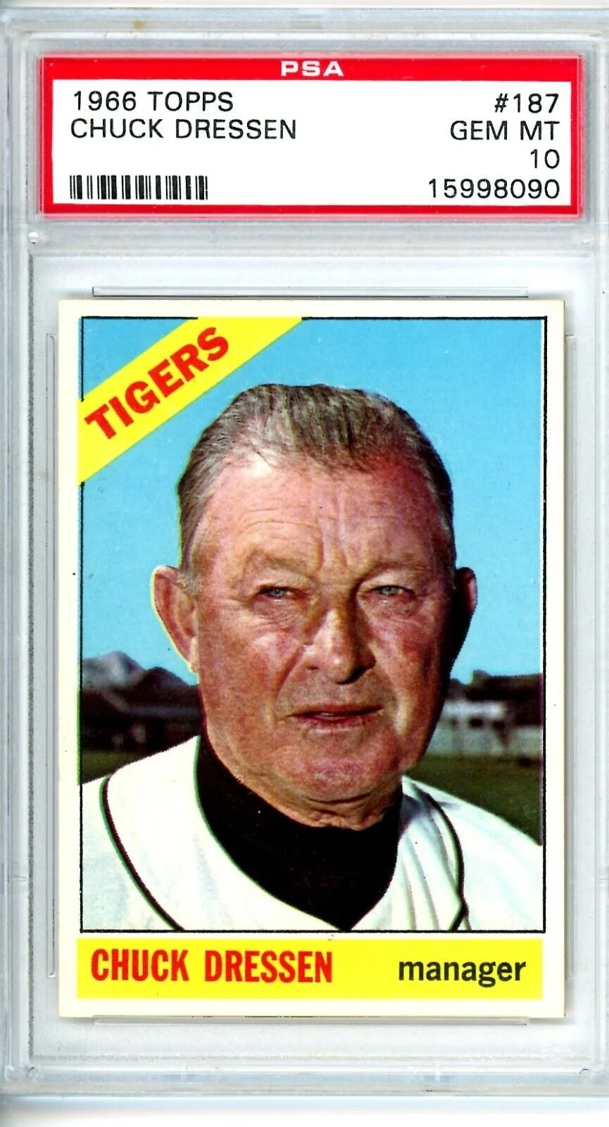 Shop › 1966 Topps Chuck Dressen #187 Tigers PSA 10 11206 Image 1 of 1 1966 Topps Chuck Dressen #187 Tigers PSA 10 11206 $1,077.00 Thousands of high grade PSA cards available New cards added weekly Always check KRISKEPPLERSPORTSCARDS Add To Cart Added! Thousands of high grade PSA cards available New cards added weekly Always check KRISKEPPLERSPORTSCARDS