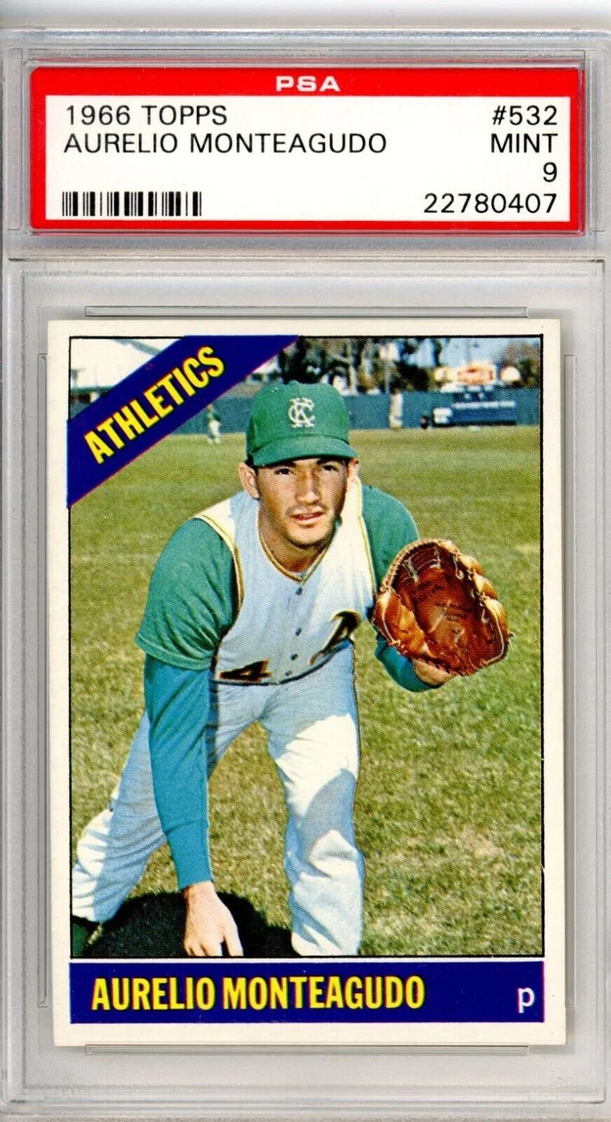 Shop › 1966 Topps Aurelio Monteagudo 532 PSA 9 A's Image 1 of 1 1966 Topps Aurelio Monteagudo 532 PSA 9 A's $250.00 Thousands of high grade PSA cards available New cards added weekly Always check KRISKEPPLERSPORTSCARDS Add To Cart Added! Thousands of high grade PSA cards available New cards added weekly Always check KRISKEPPLERSPORTSCARDS