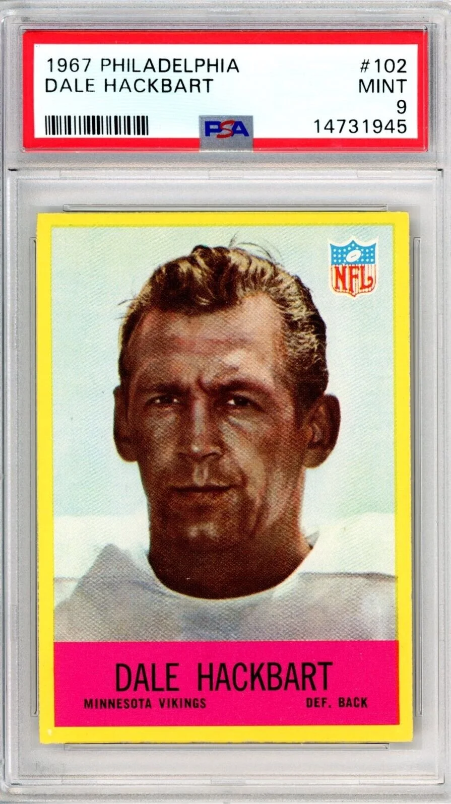 Shop › 1967 Philadephia Dale Hackbart 102 PSA 9 Vikings Image 1 of 1 1967 Philadephia Dale Hackbart 102 PSA 9 Vikings $350.00 Thousands of high grade PSA cards available New cards added weekly Always check KRISKEPPLERSPORTSCARDS Add To Cart Added! Thousands of high grade PSA cards available New cards added weekly Always check KRISKEPPLERSPORTSCARDS
