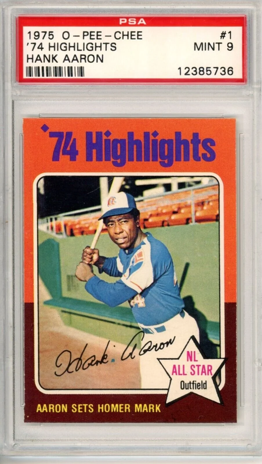 Shop › 1975 OPC Hank Aaron 1 PSA 9 Braves 10966 Tough!!!!!! Image 1 of 1 1975 OPC Hank Aaron 1 PSA 9 Braves 10966 Tough!!!!!! $4,972.00 Thousands of high grade PSA cards available New cards added weekly Always check KRISKEPPLERSPORTSCARDS Add To Cart Added! Thousands of high grade PSA cards available New cards added weekly Always check KRISKEPPLERSPORTSCARDS