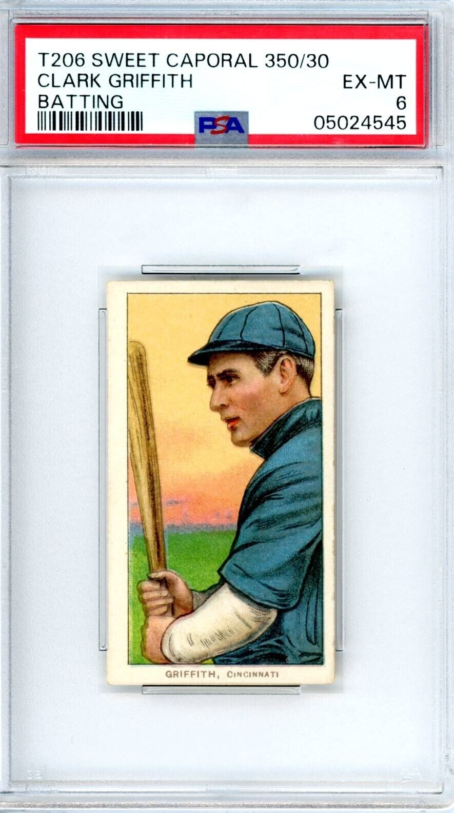 Shop › T206 Sweet Cap 350/30 Clark Griffith Batting PSA 6 14049 Cincinnati Image 1 of 1 T206 Sweet Cap 350/30 Clark Griffith Batting PSA 6 14049 Cincinnati $2,099.00 Thousands of high grade PSA cards available New cards added weekly Always check KRISKEPPLERSPORTSCARDS Add To Cart Added! Thousands of high grade PSA cards available New cards added weekly Always check KRISKEPPLERSPORTSCARDS